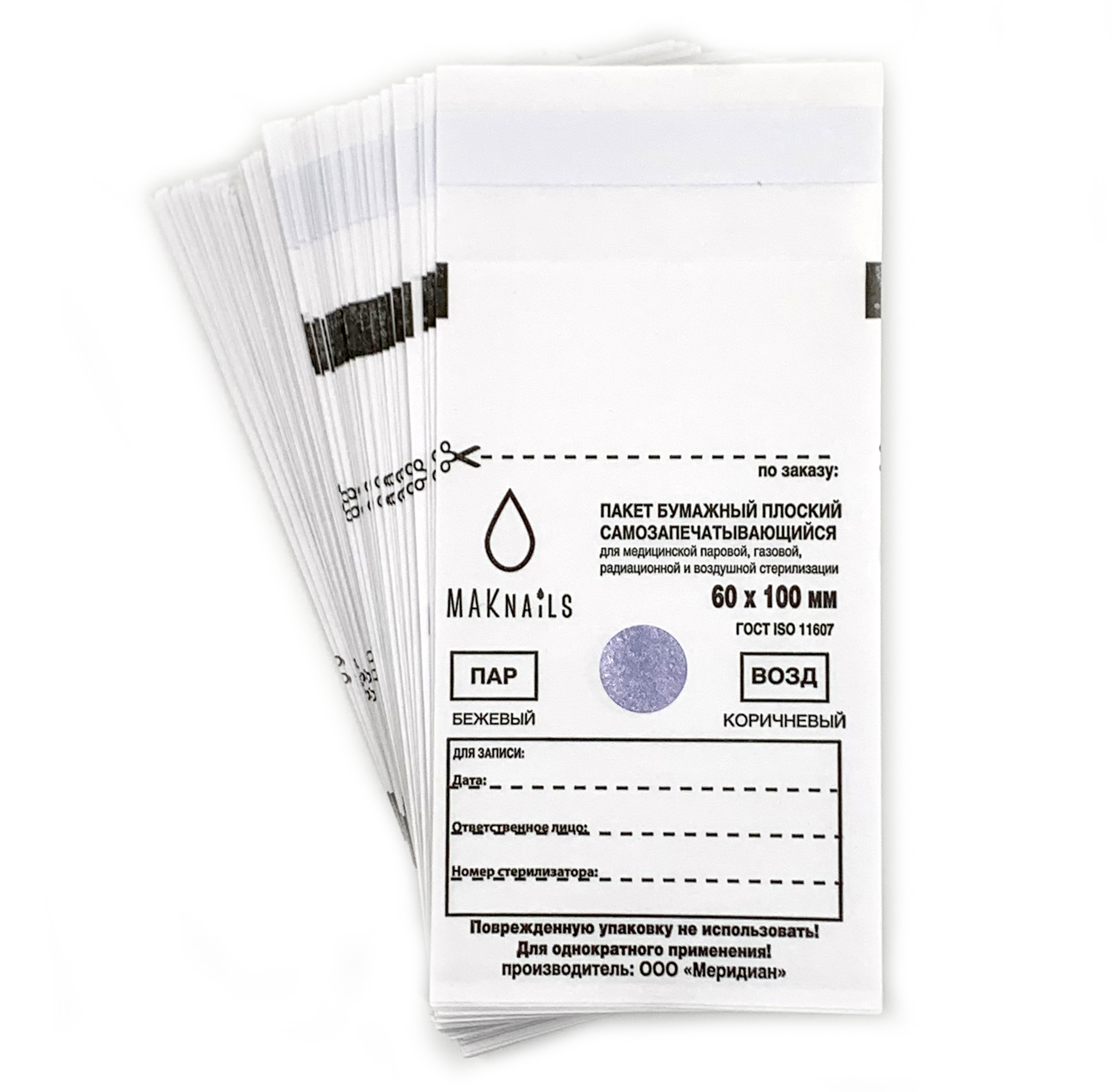 MAKnails Крафт-пакеты для стерилизации инструментов с индикатором 60*100мм, 100шт. Белые